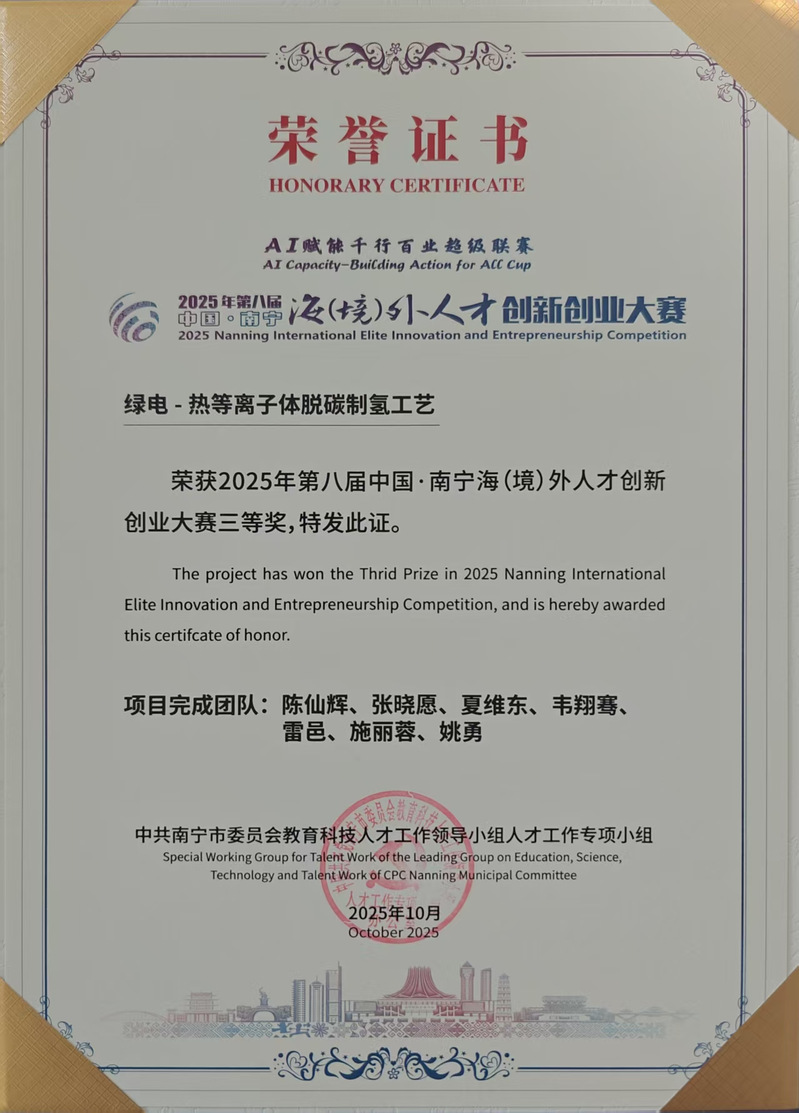 近日,第八届中国・南宁海(境)外人才创新创业大赛决赛(简称:南宁海创)在南宁圆满落幕。中国科大碳中和研究院夏维东团队的特任副研究员陈仙辉,凭借“绿电 - 热等离子体脱碳制氢工艺” 项目脱颖而出,荣获南宁海创大赛三等奖(新材料赛道第 4 名),彰显了碳中和研究院在新能源与新材料交叉领域的科研实力与创新潜力。