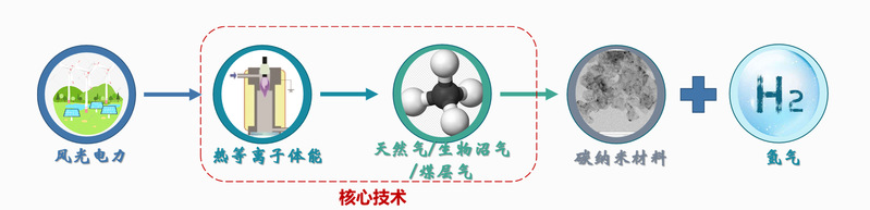 碳中和研究院团队研发的“绿电 - 热等离子体脱碳制氢工艺”,直面氢能产业 “煤基化” 高碳排与绿氢成本居高不下的双重挑战,创新性采用电弧热等离子体技术,无需催化剂、溶剂或水,通过电力驱动产生高温高活性反应氛围,一步法直接裂解甲烷原料气,同步生成高纯度氢气(纯度>85 %)与纳米碳材料,从源头消除 CO₂直接排放,能耗控制在 20kWh/kg 以内。该工艺甲烷转化率超 98.5%,构建了 “碳 - 氢” 协同价值体系,每吨氢气生产可同步产出接近3 吨纳米碳材料,副产品在锂电负极、特种橡胶等领域应用广泛。